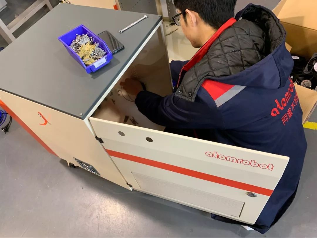 电控柜和线缆制作完成后进行上电前的检查工作,准备上电时,打开空开前,要用万用表测量下空开上口电压是否正常,是否缺相,确认无误后打开空开,按下启动按钮,上电后,观察控制器,驱动器指示灯,显示屏是否有显示,风扇是否正常启动。电控柜的初步上电完成后需要联系调试人员,并配合调试人员进行场内调试,在调试前期配合调试人员进行线路故障的问题解决,协助调试人员进行机械手的零点标定,以及物料摆放等工作。